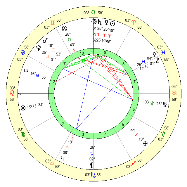 | Sun | 19 Aries 57 | 21 Aries 4 | 10 Leo 27 |
