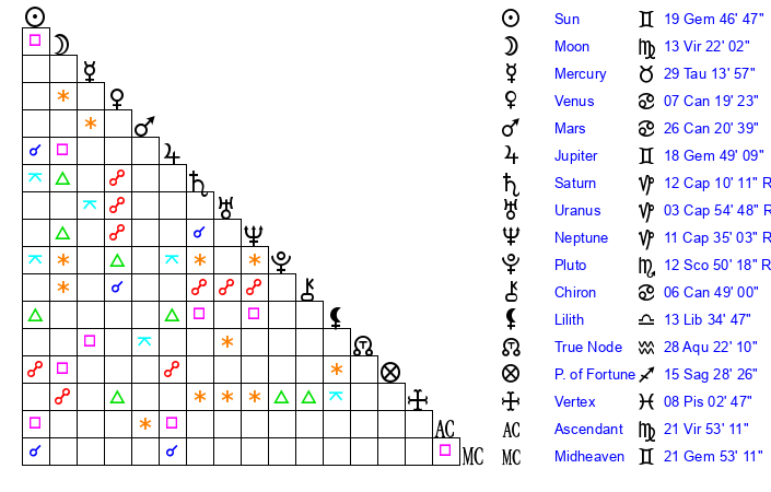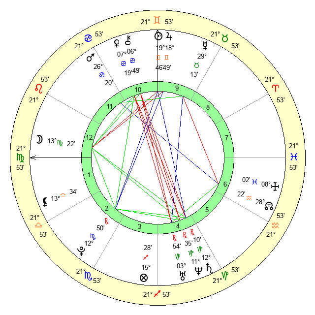 | Moon | 13 Virgo 25 | 13 Sagittarius 11 | 28 Sagittarius 53 |