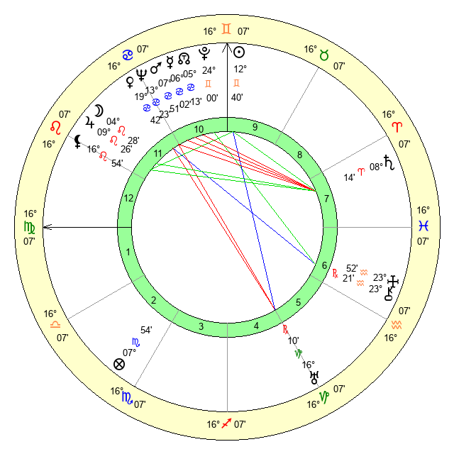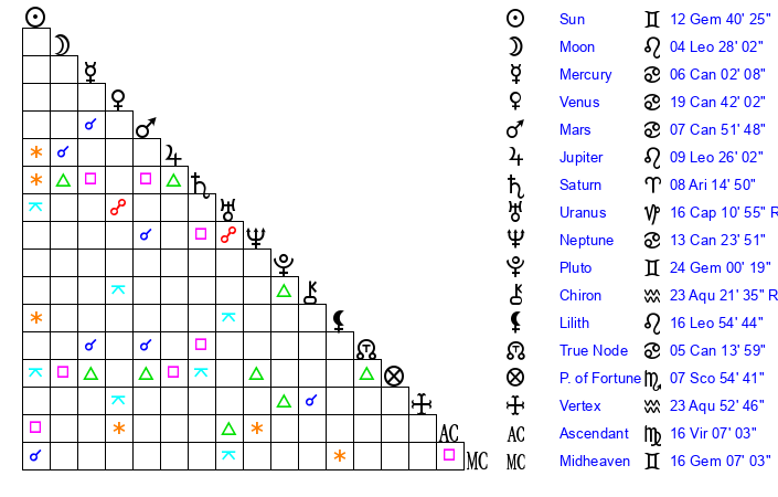 | Sun | 12 Gemini 41 | 13 Gemini 22 | 5 Libra 9 |