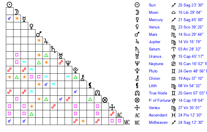 | Sun | 25 Sagittarius 24 | 26 Sagittarius 15 | 22 Aries 8 |