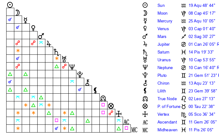 | Sun | 19 Aquarius 49 | 21 Aquarius 12 | 15 Gemini 47 |