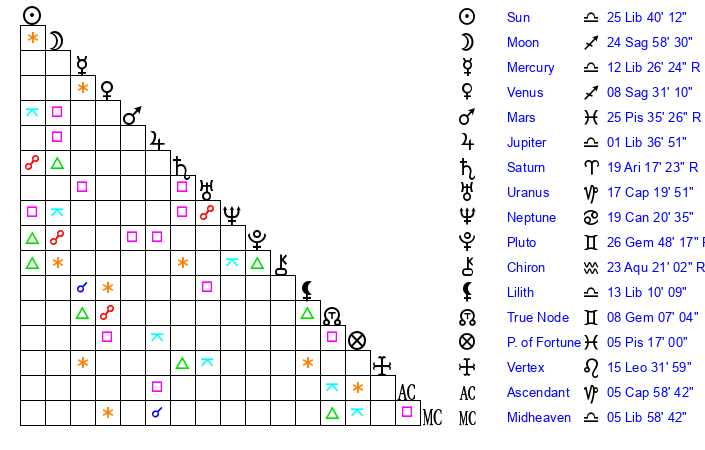 | Moon | 25 Sagittarius 0 | 6 Libra 28 | 28 Pisces 51 |