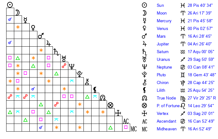 | Sun | 28 Pisces 40 | 29 Pisces 20 | 25 Cancer 35 |