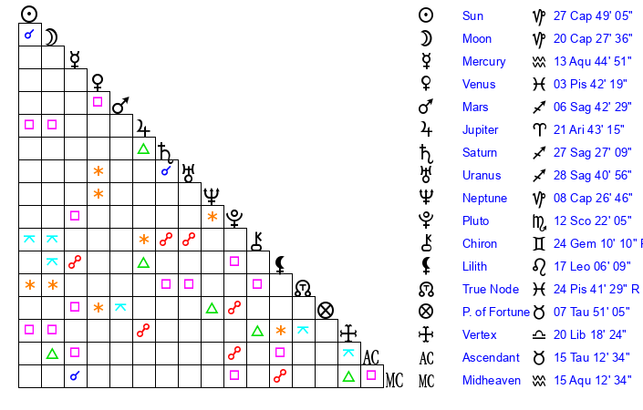 | Saturn | 27 Sagittarius 36 | 15 Pisces 59 | 0 Capricorn 58 |