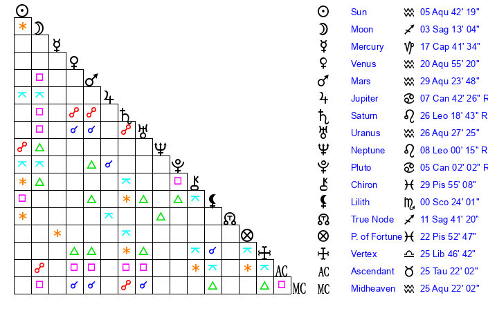 Sun | 5 Aquarius 42 | 7 Aquarius 0 | 20 Taurus 54 |