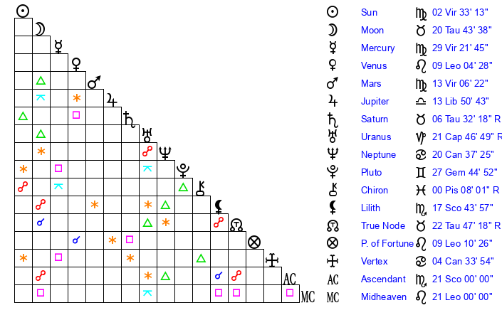| Venus | 9 Leo 5 | 1 Leo 13 | 2 Capricorn 33 |