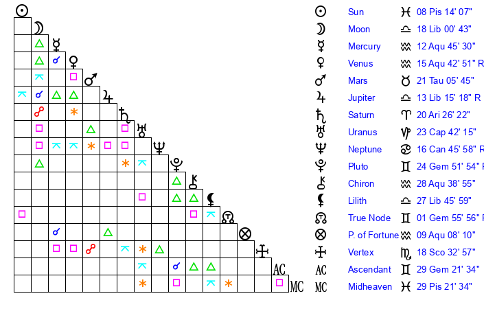 | Mercury | 12 Aquarius 46 | 24 Pisces 8 | 7 Gemini 59 |