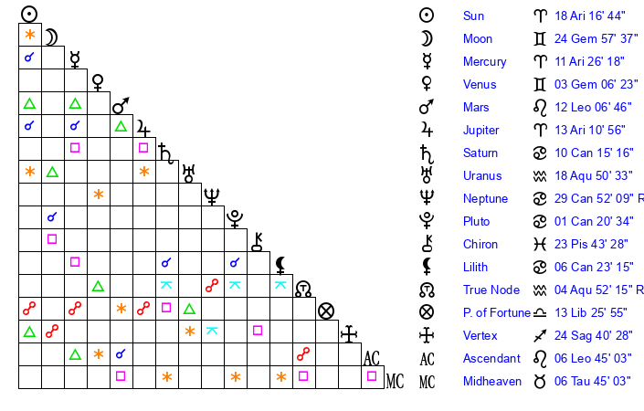 | Moon | 24 Gemini 56 | 28 Leo 36 | 23 Gemini 39 |
