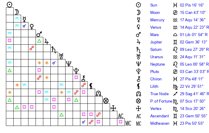 Sun | 2 Pisces 16 | 3 Pisces 19 | 17 Gemini 4 |