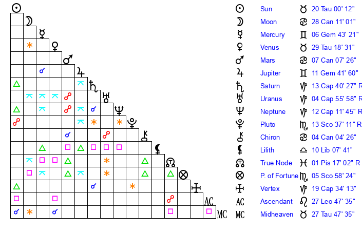 | Sun | 20 Taurus 0 | 20 Taurus 17 | 24 Gemini 33 |