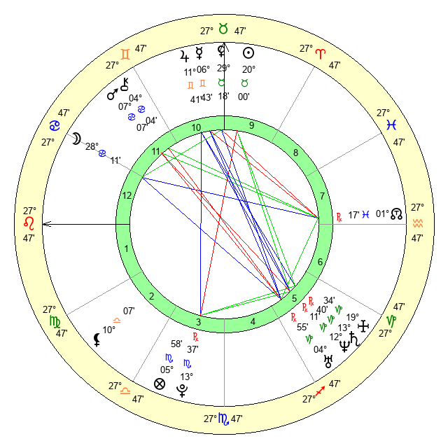 | Moon | 28 Cancer 17 | 28 Libra 28 | 12 Scorpio 55 |