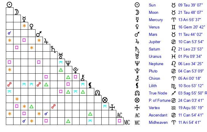 Uranus | 25 Aquarius 8 | 23 Taurus 39 | 0 Pisces 39 |