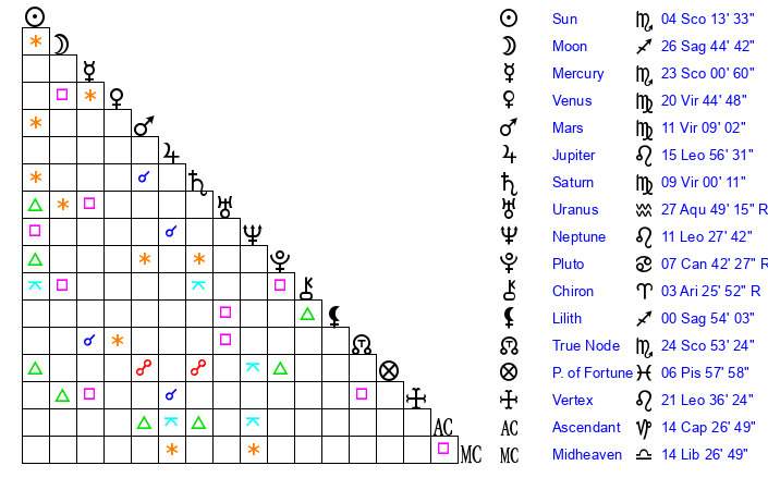 Moon | 26 Sagittarius 47 | 24 Virgo 22 | 7 Scorpio 57 |