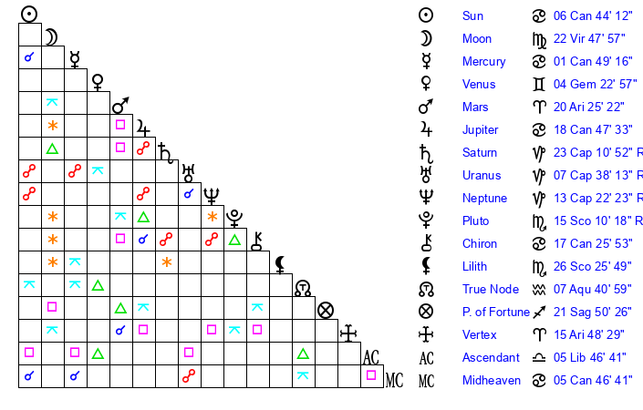 | Moon | 22 Virgo 56 | 19 Leo 48 | 25 Sagittarius 26 |