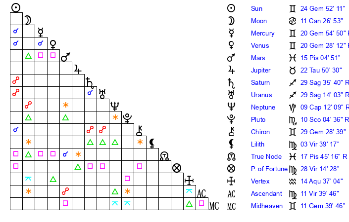 | Venus | 20 Gemini 27 | 9 Taurus 46 | 19 Gemini 27 |