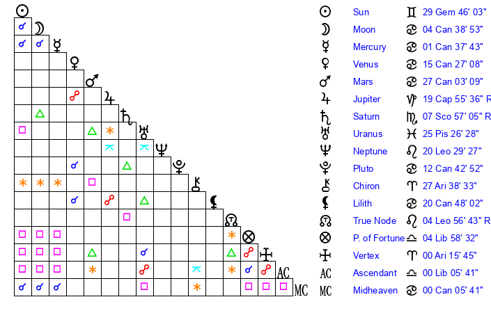 | Sun | 29 Gemini 46 | 0 Cancer 34 | 6 Libra 1 |
