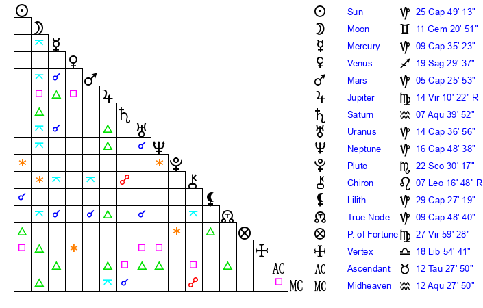 | Mercury | 9 Capricorn 35 | 12 Capricorn 9 | 4 Pisces 27 |