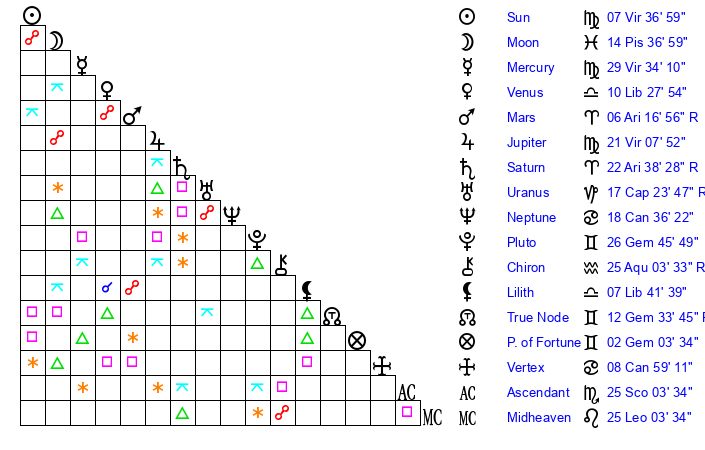| Sun | 7 Virgo 37 | 8 Virgo 32 | 3 Capricorn 18 |