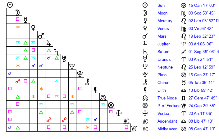 Pluto | 15 Cancer 28 | 2 Aquarius 58 | 17 Cancer 10 |
