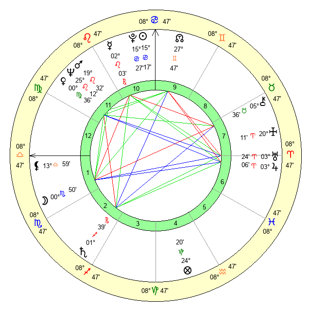Mercury | 2 Leo 3 | 11 Leo 58 | 14 Scorpio 17 |