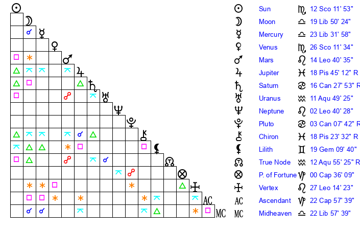 | Venus | 26 Scorpio 12 | 22 Sagittarius 45 | 10 Aries 53 |