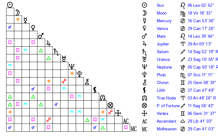 | Moon | 18 Virgo 23 | 5 Libra 49 | 14 Aquarius 2 |