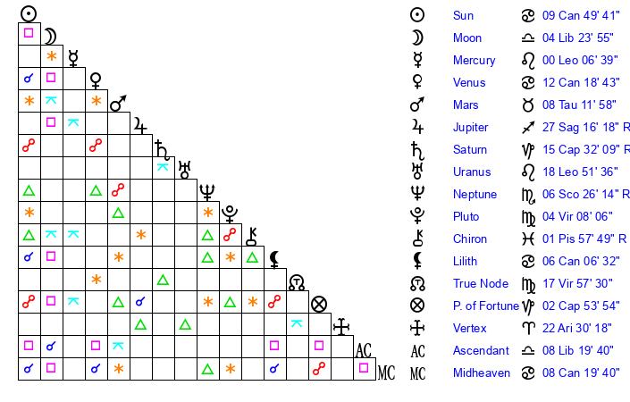 | Neptune | 6 Scorpio 25 | 2 Aries 10 | 6 Scorpio 58 |