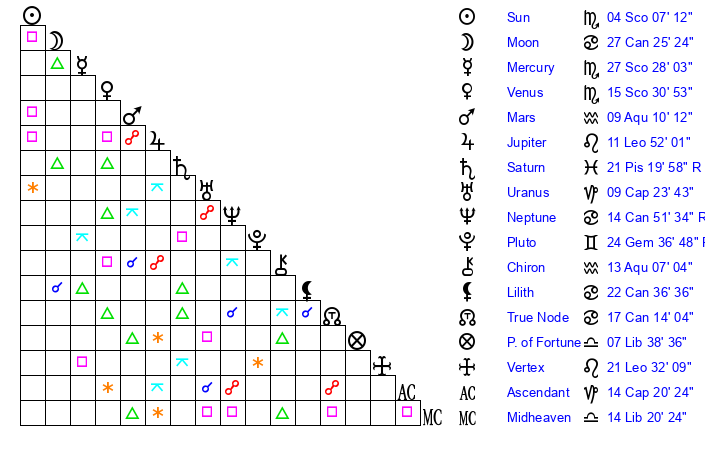 | Venus | 15 Scorpio 32 | 18 Libra 27 | 11 Aries 32 |