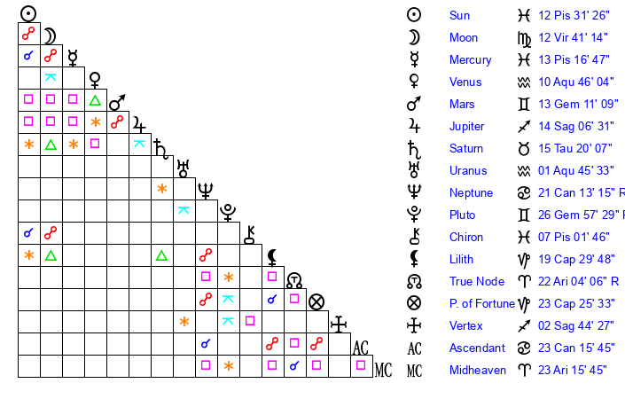 | Sun | 12 Pisces 31 | 13 Pisces 7 | 2 Cancer 32 |