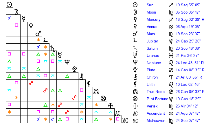 | Saturn | 21 Scorpio 16 | 13 Pisces 15 | 26 Scorpio 23 |