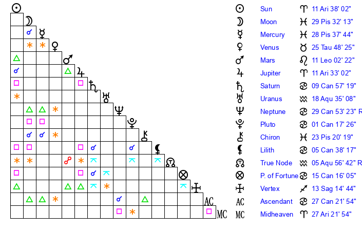 | Sun | 11 Aries 38 | 12 Aries 13 | 26 Cancer 38 |