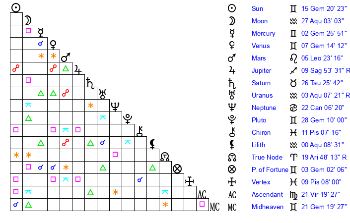 | Sun | 15 Gemini 20 | 16 Gemini 0 | 3 Libra 57 |