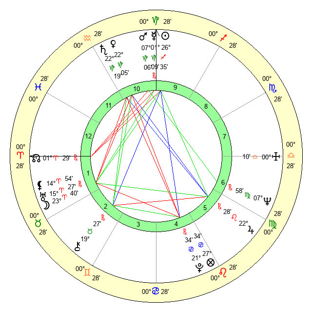 | Moon | 23 Aries 41 | 19 Leo 12 | 15 Virgo 45 |