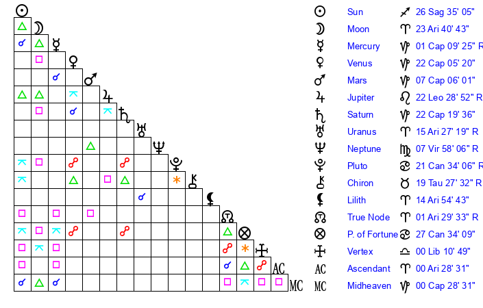 | Moon | 23 Aries 41 | 19 Leo 12 | 15 Virgo 45 |