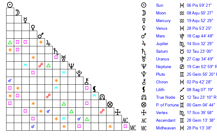 | Mercury | 19 Aquarius 53 | 22 Pisces 24 | 13 Gemini 7 |