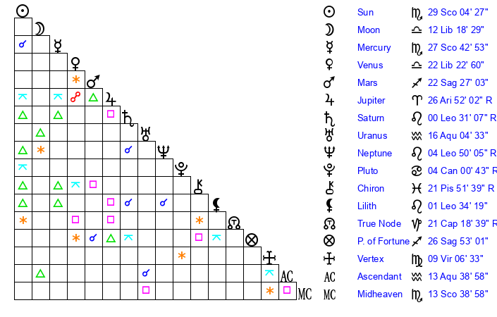 | Sun | 29 Scorpio 4 | 29 Scorpio 53 | 18 Pisces 34 |