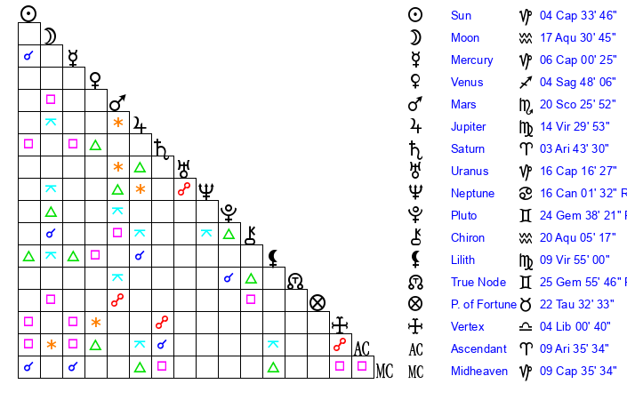 | Pluto | 24 Gemini 38 | 0 Aquarius 54 | 24 Gemini 9 |