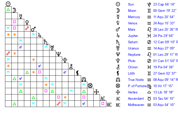 | Mercury | 11 Aquarius 21 | 10 Capricorn 12 | 1 Gemini 12 |