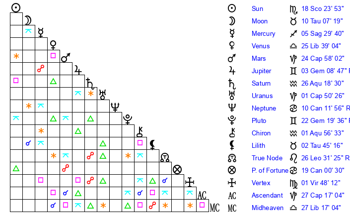 | Sun | 10 Capricorn 24 | 11 Capricorn 17 | 10 Taurus 23 |