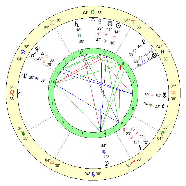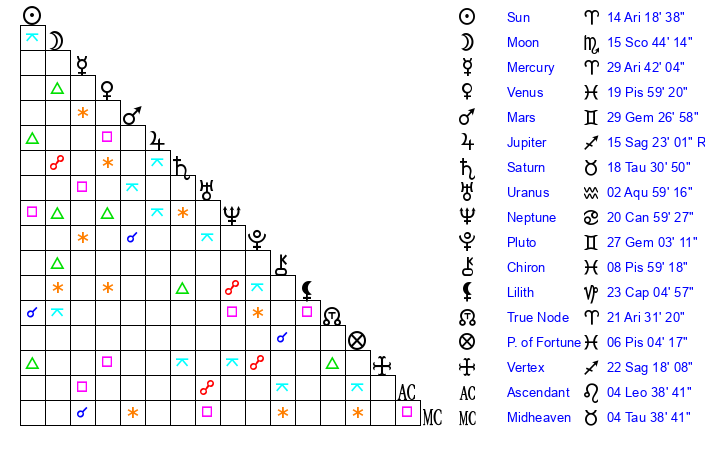 | Sun | 14 Aries 18 | 14 Aries 56 | 3 Leo 3 |