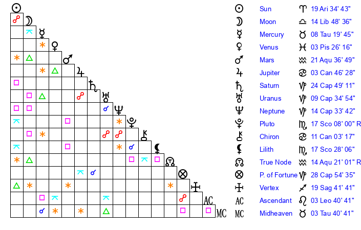 | Moon | 14 Libra 41 | 13 Virgo 48 | 17 Capricorn 22 |