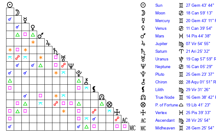 | Sun | 27 Gemini 44 | 28 Gemini 40 | 19 Libra 43 |