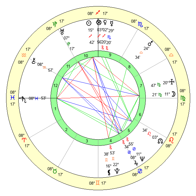 | Moon | 11 Virgo 18 | 17 Pisces 59 | 15 Capricorn 40 |