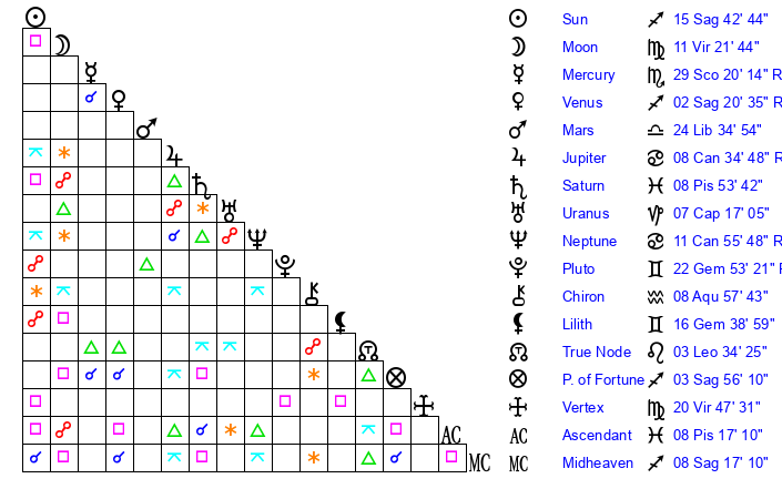 | Moon | 11 Virgo 18 | 17 Pisces 59 | 15 Capricorn 40 |