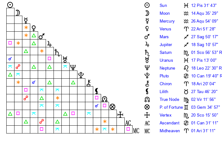 Moon | 14 Aquarius 34 | 28 Aries 56 | 13 Libra 58 |