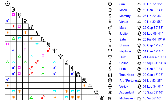 | Sun | 6 Libra 23 | 7 Libra 47 | 5 Aquarius 22 |