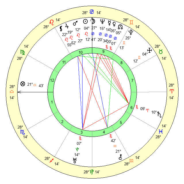 | Moon | 27 Cancer 37 | 10 Virgo 48 | 2 Scorpio 37 |