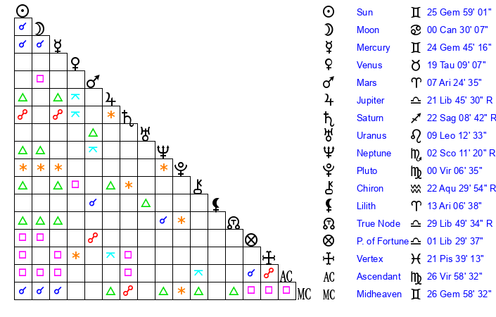 | Sun | 25 Gemini 59 | 26 Gemini 45 | 0 Virgo 2 |
