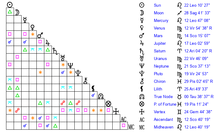 | Mercury | 12 Leo 48 | 5 Leo 23 | 13 Scorpio 33 |