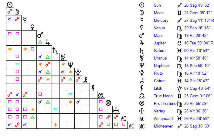 | Pluto | 16 Virgo 20 | 0 Aquarius 40 | 15 Virgo 28 |